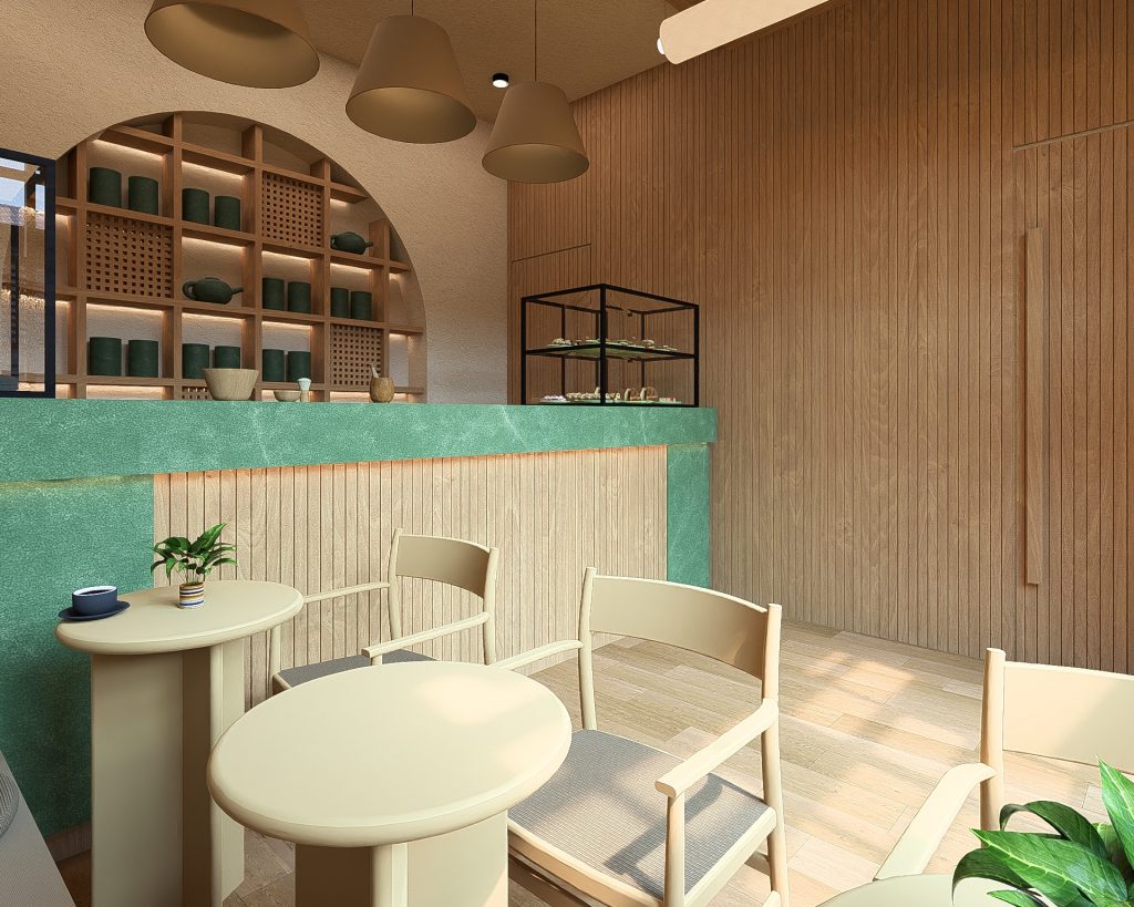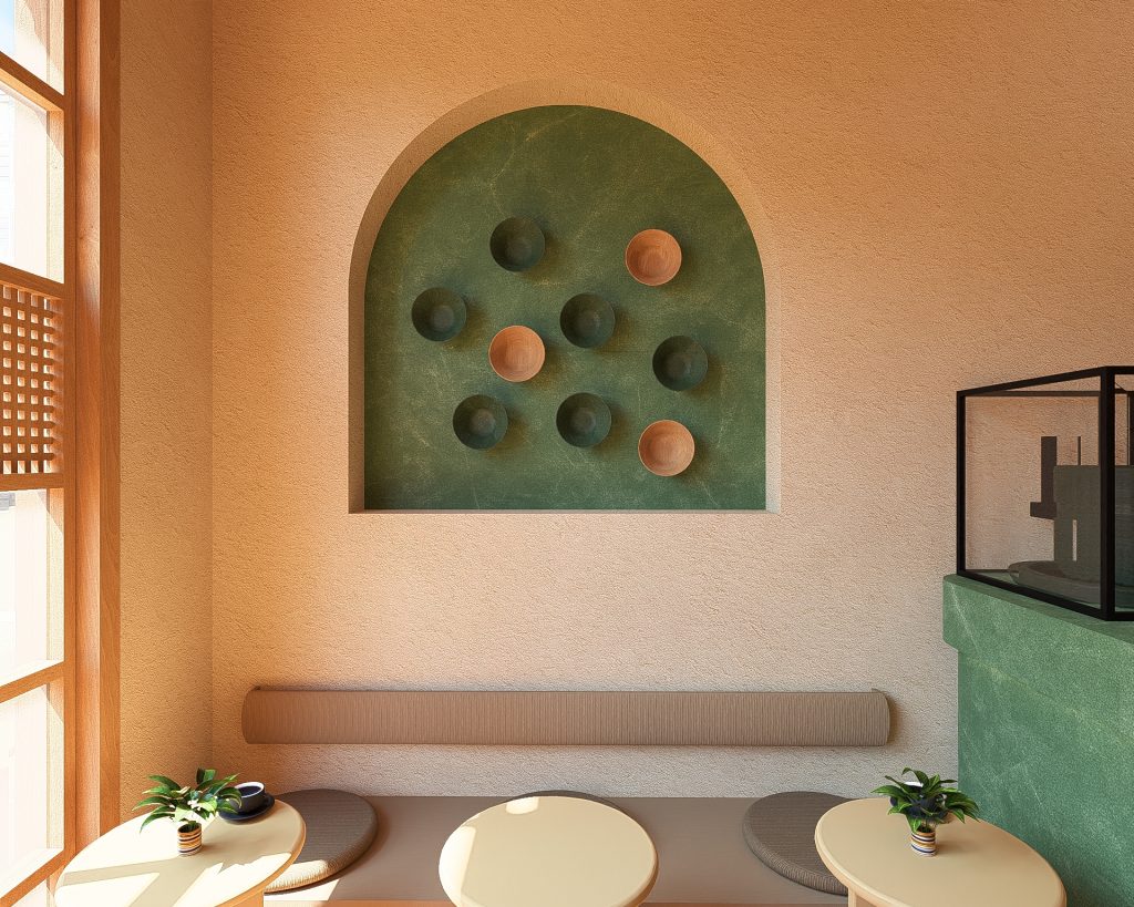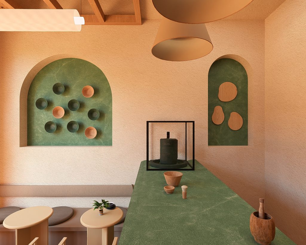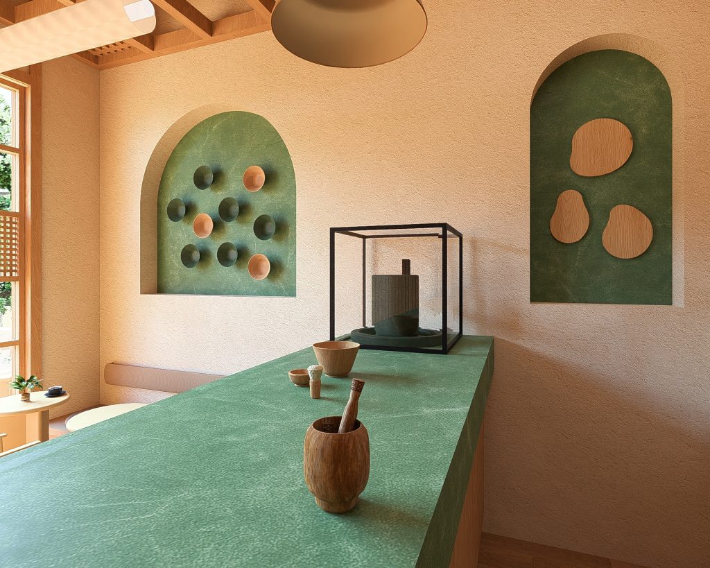 - Yeşil Mermerin Doğal Karakteri: Mekanın omurgasını oluşturan yeşil mermer, sadece bir yüzey değil, matchanın doğuşunu simgeleyen monolitik bir öğedir. Mermerin doğal damarları, mekanın içinde birer organik nehir gibi akar; pürüzsüz dokusu ise kaliteyi ve kalıcılığı temsil eder. Mermer, dingin bir lüks algısı yaratır.