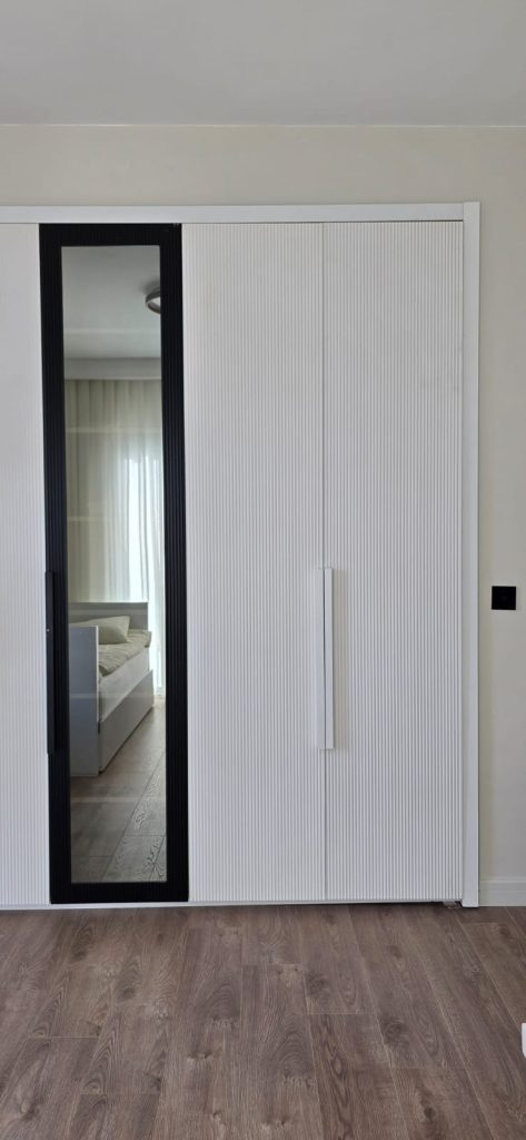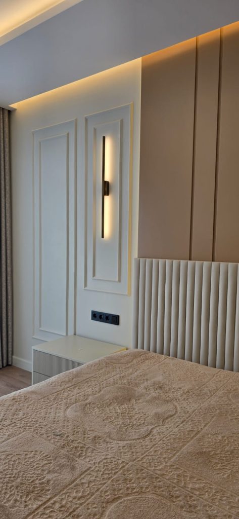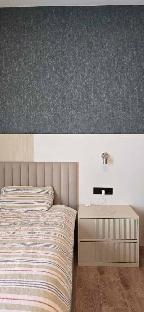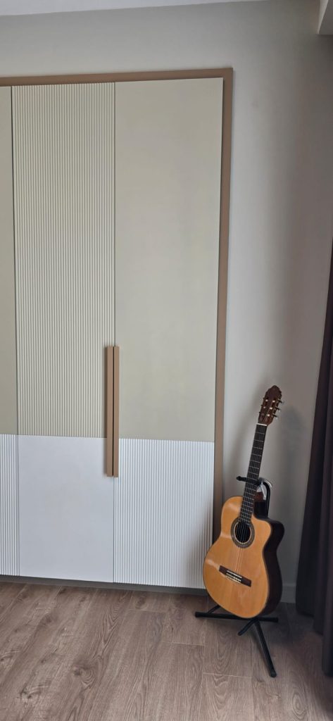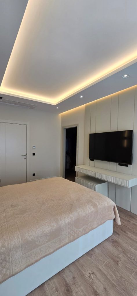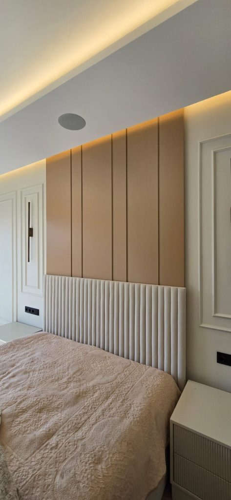 Konforun ön planda tutulduğu ebeveyn yatak odasında, dinginlik ve sade lüks bir araya gelmiştir. Gömme dolap sistemleri ve doğal malzeme dokuları ile fonksiyonellik ön planda tutulurken, sıcak ve huzurlu bir atmosfer yaratılmıştır.