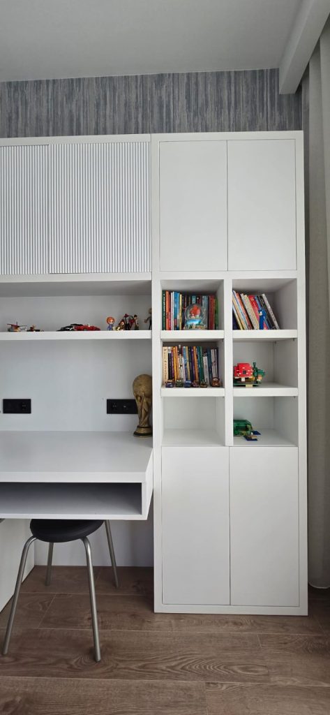 İki ayrı çocuk odası, çocukların yaş gruplarına ve kişisel ilgi alanlarına uygun olarak tasarlanmıştır. Renk seçimleri, doğal ışık kullanımı ve ergonomik mobilyalarla hem oyun oynamaya hem de ders çalışmaya elverişli alanlar oluşturulmuştur. Her odada depolama çözümleri sade bir şekilde entegre edilmiştir.