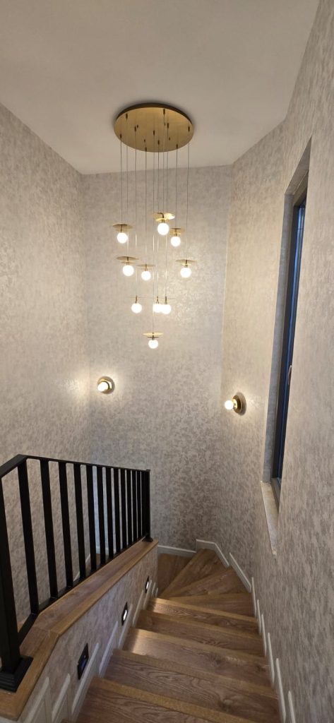 Alanlar arası geçişi sağlayan merdiven ve hol bölümleri, projenin genel modern çizgileriyle uyumlu olarak tasarlanmıştır. Minimalist aydınlatma elemanları ve doğal malzeme kullanımıyla, bu alanlar sadece geçiş değil aynı zamanda görsel bir süreklilik hissi sağlar.